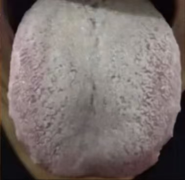 Today let’s talk about this inexpensive Huoxiang Zhengqi Liquid — it’s quite effective at clearing thick greasy coating. Look at this tongue image: the tongue coating is white and greasy, like heavy snowfall. This is not just a problem of excessive dampness; it’s typical cold-damp turbidity, obstructing the spleen, stomach, and intestines.